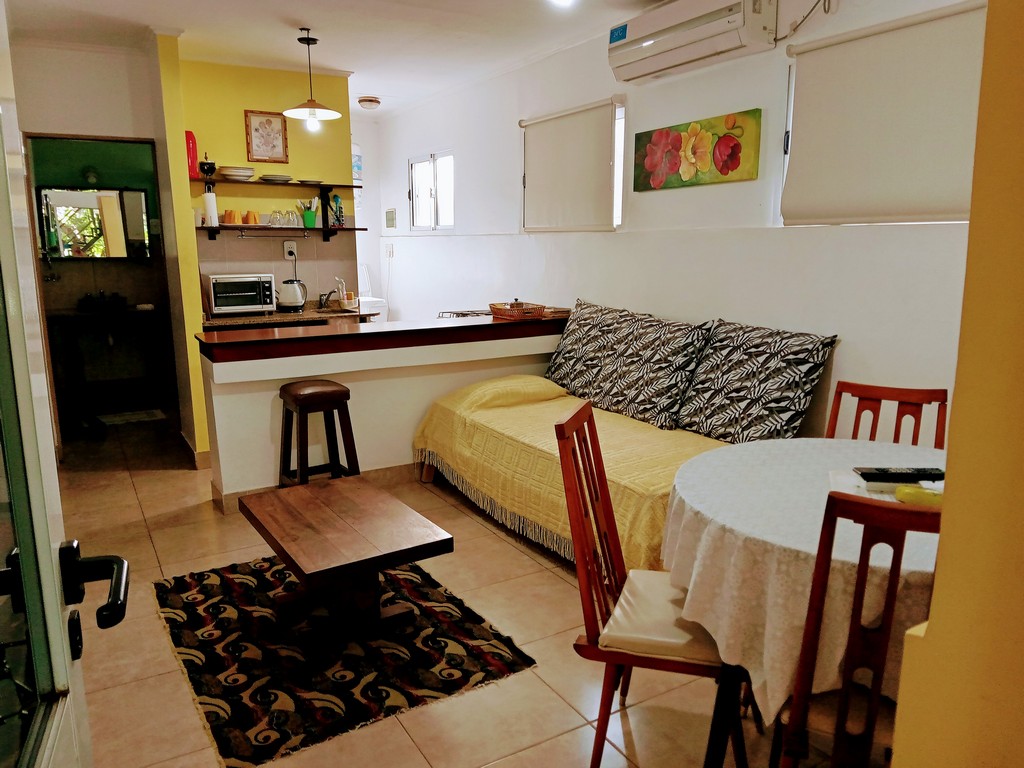 Apartamento de un dormitorio con cama matrimonial. Está equipado con aire acondicionado, baño privado y zona de cocina con ne...